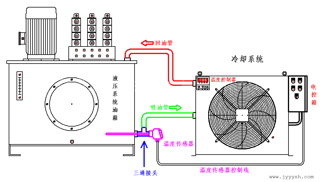 剑邑液压科技(上海)有限公司生产的ELA系列自动温控型独立循环风冷式油冷却系统可以有效的解决油温问题,ELA系列自动温控型独立循环风冷式油冷却系统是一款集成循环泵组,温度控制器,温度传感器,冷却风扇,铝制板翅式散热器,压力监测表,电气控制箱于一体的智能型风冷式油冷却系统,冷却系统有自动温控启停模式和手动启停模式,冷却温度可根据实际需要调节,温度调节范围是-10°C至120°C,冷却系统的安装也非常便捷,温度传感器探头安装于液压系统润滑系统的油箱侧面安装孔,传感器探头和油泵吸油管是通过一个三通接头 一端安装于油箱侧面液面以下,一端安装温度传感器探头,另外一端安装油泵吸油管,必须保证温度传感器探头在液面以下,确保正常探测油箱油温实时传输信号至冷却系统的温度控制器,可通过温度控制器调节需要冷却的油温,实现油泵电机和风扇电机的自动启停功能,达到节能效果,也可以手动按钮启动或停止。