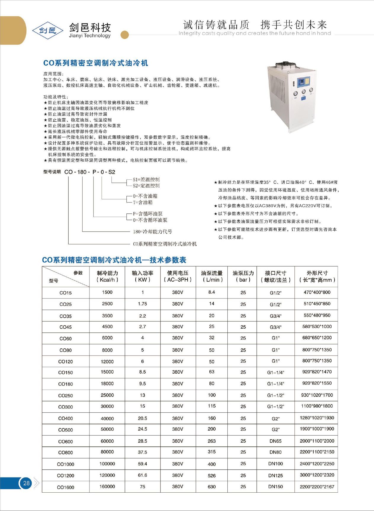 剑邑CO系列精密空调制冷式冷却系统 广泛应用于:液压系统,润滑系统,真空泵设备,包装设备,CNC加工中心,注塑机械,激光切割机械,焊接设备,雕刻机,线切割机械,中频炉,变压器,永磁电机,变频器,船用设备,矿山机械,减速机齿轮箱,等自动化机械设备油温/水温冷却控制。