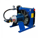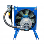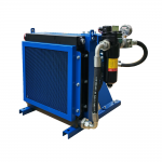 本系列产品特点是循环油泵和冷却风扇共用一个双出轴电机驱动,双出轴电机一端驱动油泵另一端连接风叶,结构紧凑,设计合理。特别适用于安装空间有限的场合,循环电机泵组和冷却风扇可以形成形成安全独立的循环冷却回路,能够完全有效的避免主机系统回油压力冲击对散热器造成损坏。配置滤油器还可以对主机系统的油进行循环过滤达到冷却和清洁双重效果。冷却系统配置自动温控装置可实现本地控制和PLC远程控制,实现温度设置自动启停功能。冷却原理是油/空气热交换冷却,冷却器油泵直接从主机系统的油箱内吸油到散热器,高温油的热量经过散热通道内翅片传递到散热器外翅片,在风扇的作用下使低温气流穿过散热器的外传热翅片从而将热量强制性冷却。