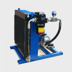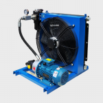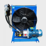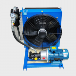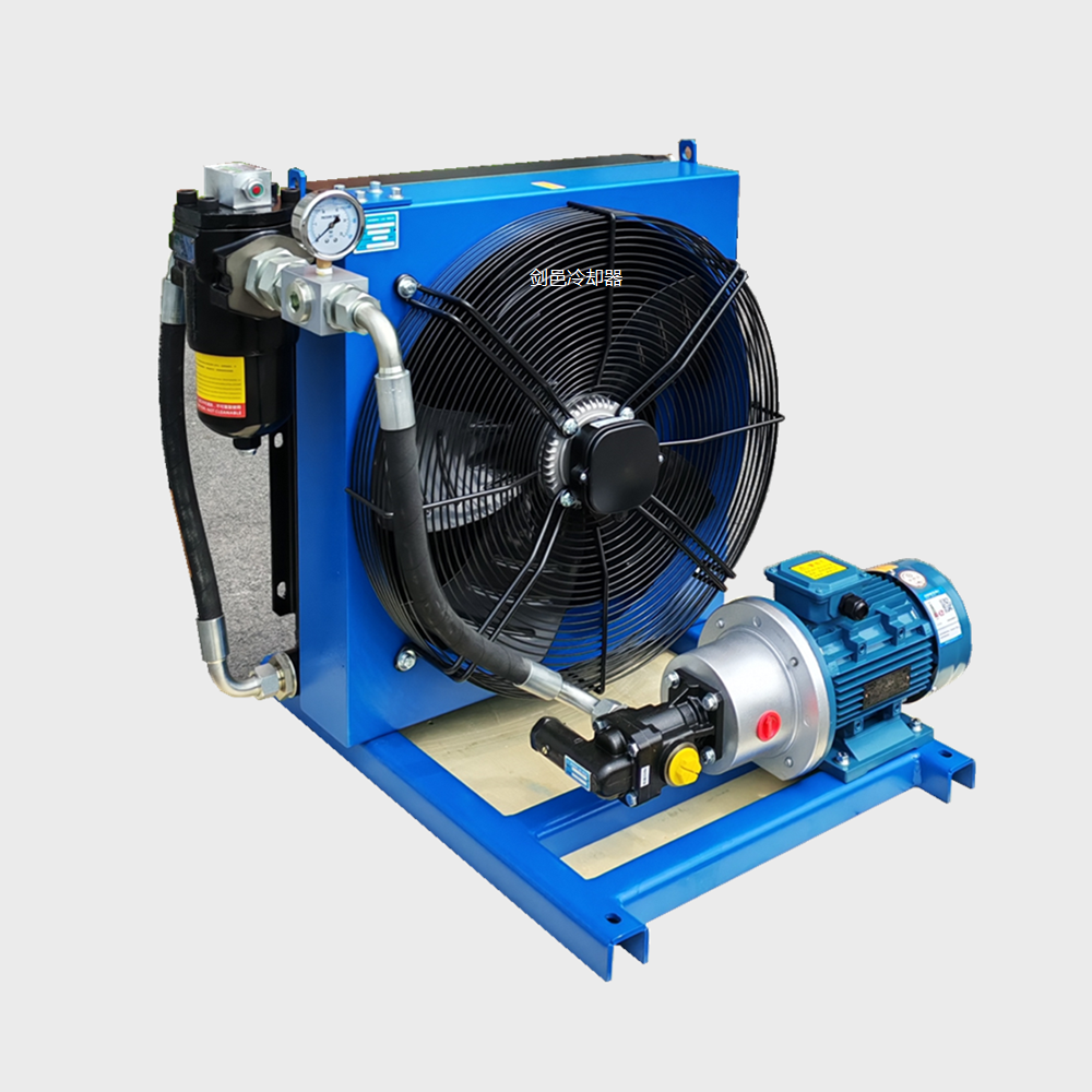 本系列产品特点是循环油泵电机和冷却风扇电机分别独立运行,可根据需要调解设定油温控制,流量控制,电机可变频调速,产品整体外形结构紧凑,设计合理,工作噪音低,非常适用于液压润滑系统,工业传动减速机齿轮箱油等压力润滑冷却,循环电机泵组和冷却风扇可以形成形成安全独立的循环冷却回路,能够完全有效的避免主机系统回油压力冲击对散热器造成损坏。配置滤油器还可以对主机系统的油进行循环过滤达到冷却和清洁双重效果。冷却系统配置自动温控装置可实现本地控制和PLC远程控制,实现温度设置自动启停功能。冷却原理是油/空气热交换冷却,冷却器油泵直接从主机系统的油箱内吸油到散热器,高温油的热量经过散热通道内翅片传递到散热器外翅片,在风扇的作用下使低温气流穿过散热器的外传热翅片从而将热量强制性冷却。